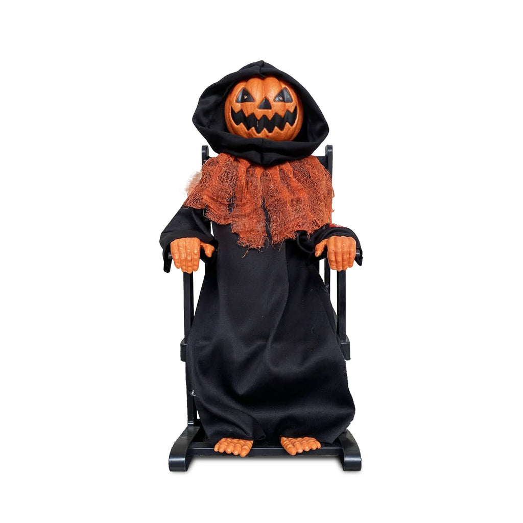 ¡Una decoración que realmente cobra vida! Este espeluznante personaje con cabeza de calabaza se balancea en su propia silla, creando un efecto inquietante y divertido a la vez. Sus ojos LED se iluminan y emite sonidos tenebrosos que harán temblar hasta al más valiente.