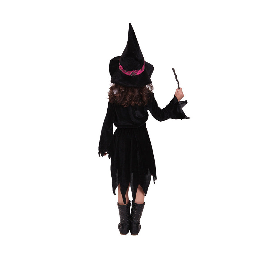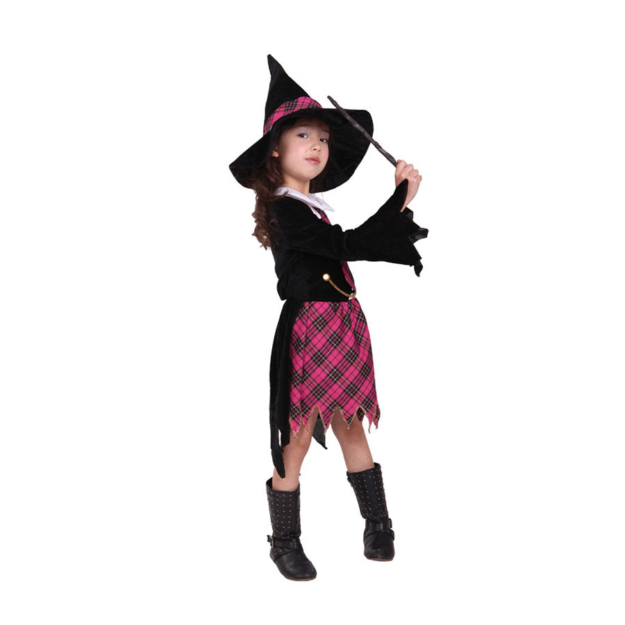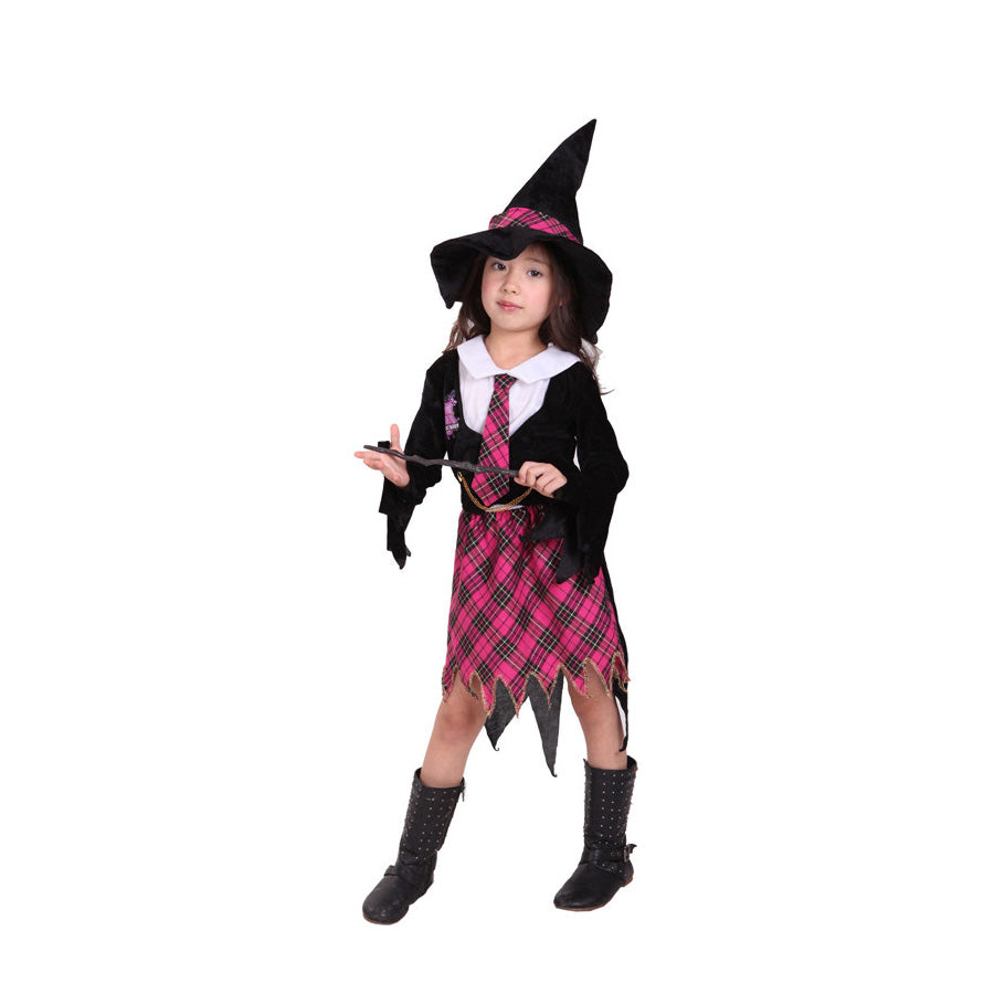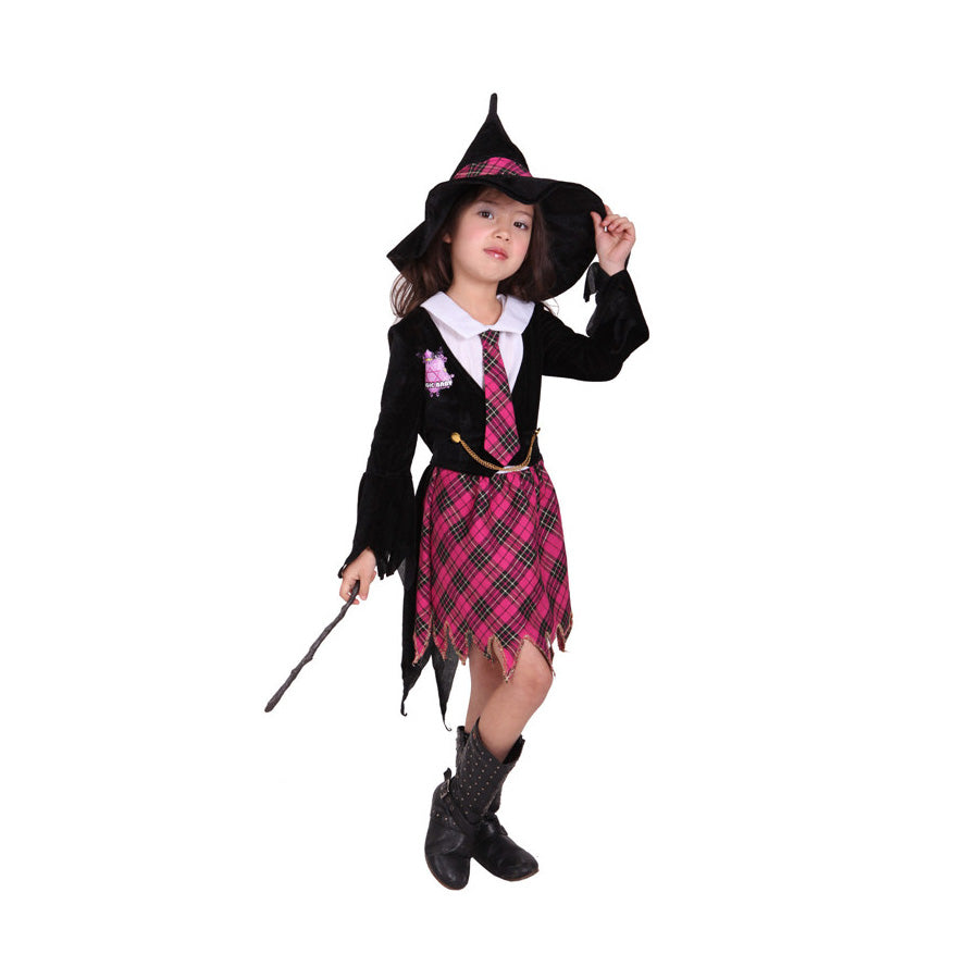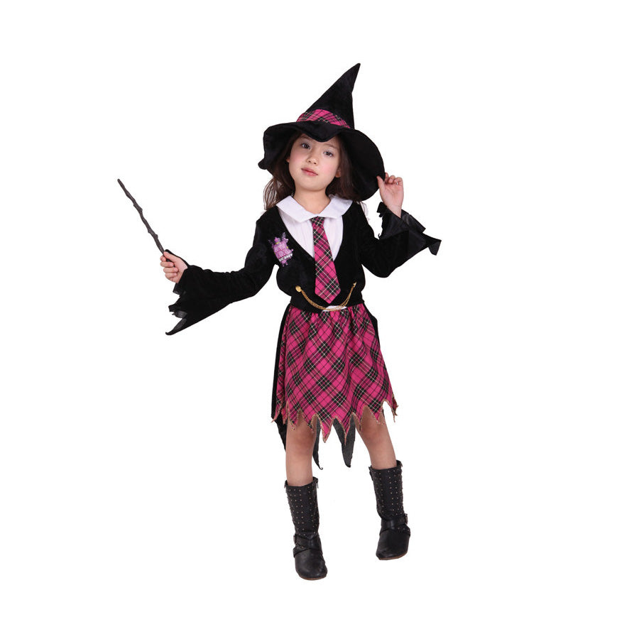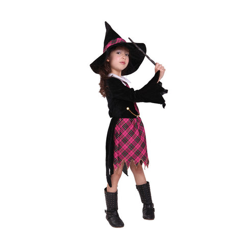 Este adorable disfraz de bruja con estilo escolar combina lo mágico con lo moderno. Con una falda escocesa rosada, chaqueta con detalles encantados y un clásico sombrero de bruja, es ideal para niñas que quieren hechizar con estilo.
