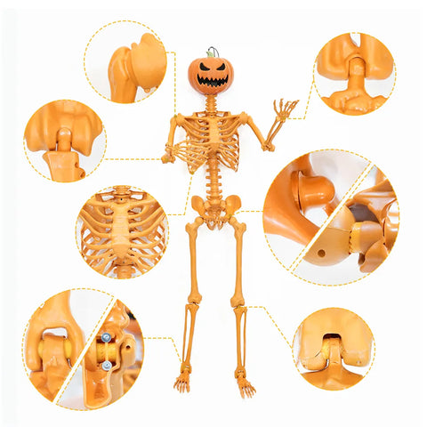 Este esqueleto articulado de tamaño real con cabeza de calabaza es perfecto para quienes buscan una decoración Halloween impactante y de gran tamaño. Fabricado en plástico sólido y duradero, sus múltiples articulaciones móviles te permiten colocarlo en distintas poses espeluznantes.