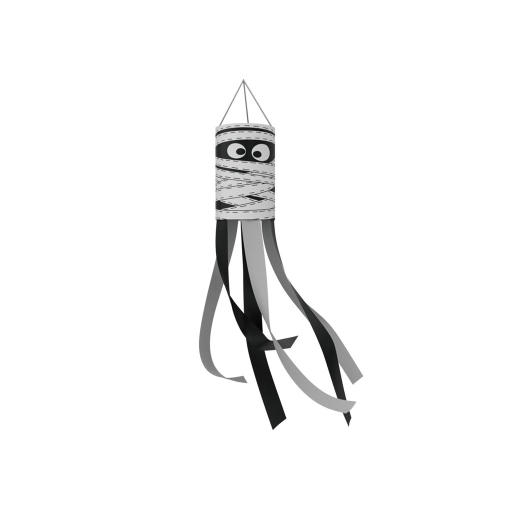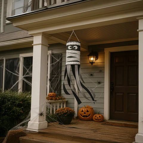 Esta simpática momia colgante se mueve con el viento, aportando un efecto visual encantador para cualquier entrada o jardín. Con su diseño tipo cometa y cintas ondeantes, es ideal para crear ambiente sin complicaciones.