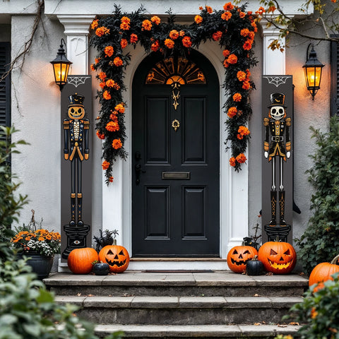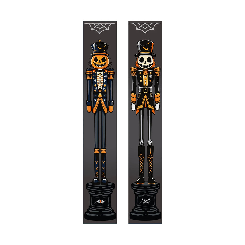 Estos dos banners de tela con diseño de soldaditos esqueléticos estilo "nutcracker" le darán un aire único y llamativo a tu decoración de Halloween. Colócalos a cada lado de la puerta para lograr un recibimiento impactante que sorprenderá a todos tus visitantes.
