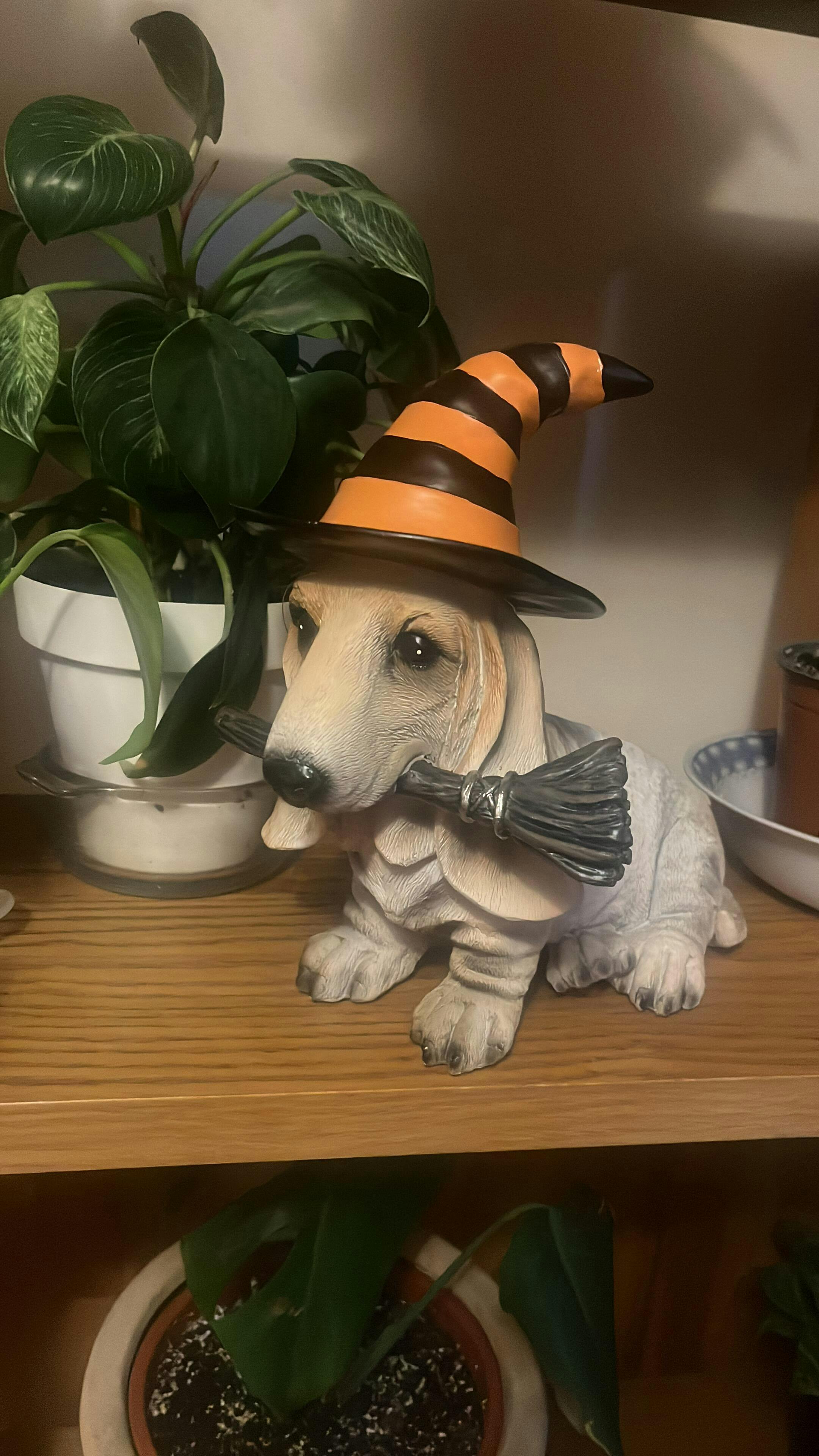- Diseño Adorable: El cachorro lleva un sombrero de bruja a rayas naranjas y negras, y sostiene una escoba en su boca, añadiendo un toque festivo y mágico a tu decoración de Halloween.
