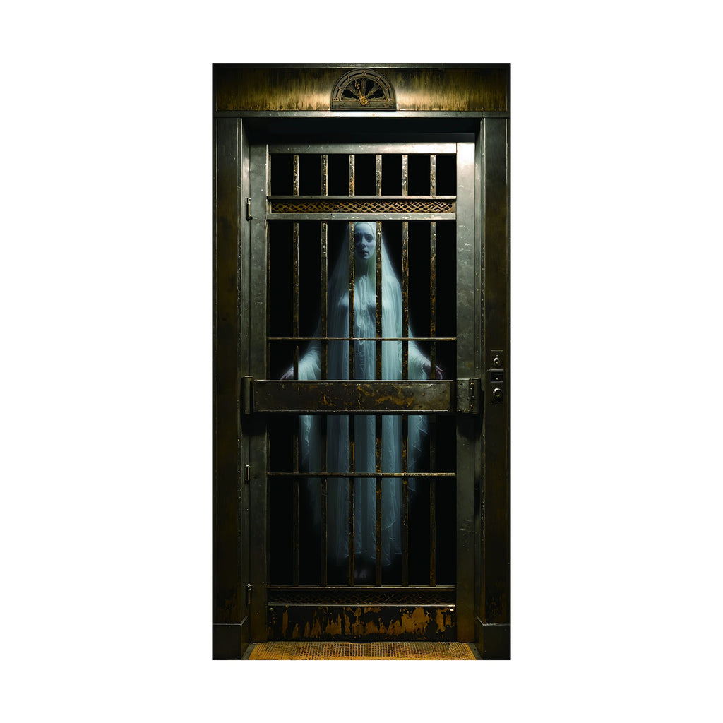 Este telón impreso en tela simula la entrada de un antiguo ascensor custodiado por un espectro flotante. El efecto visual crea una ilusión óptica perfecta para decorar entradas, pasillos o muros lisos, añadiendo un toque cinematográfico a tus ambientes de Halloween.