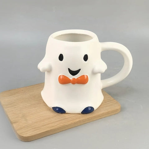 Con un diseño encantador de fantasma sonriente, este tazón de cerámica se roba todas las miradas gracias a su corbatín naranja y zapatos azules. Ideal para acompañar tus desayunos, chocolates calientes o para decorar tu cocina con un toque spooky-cute.
